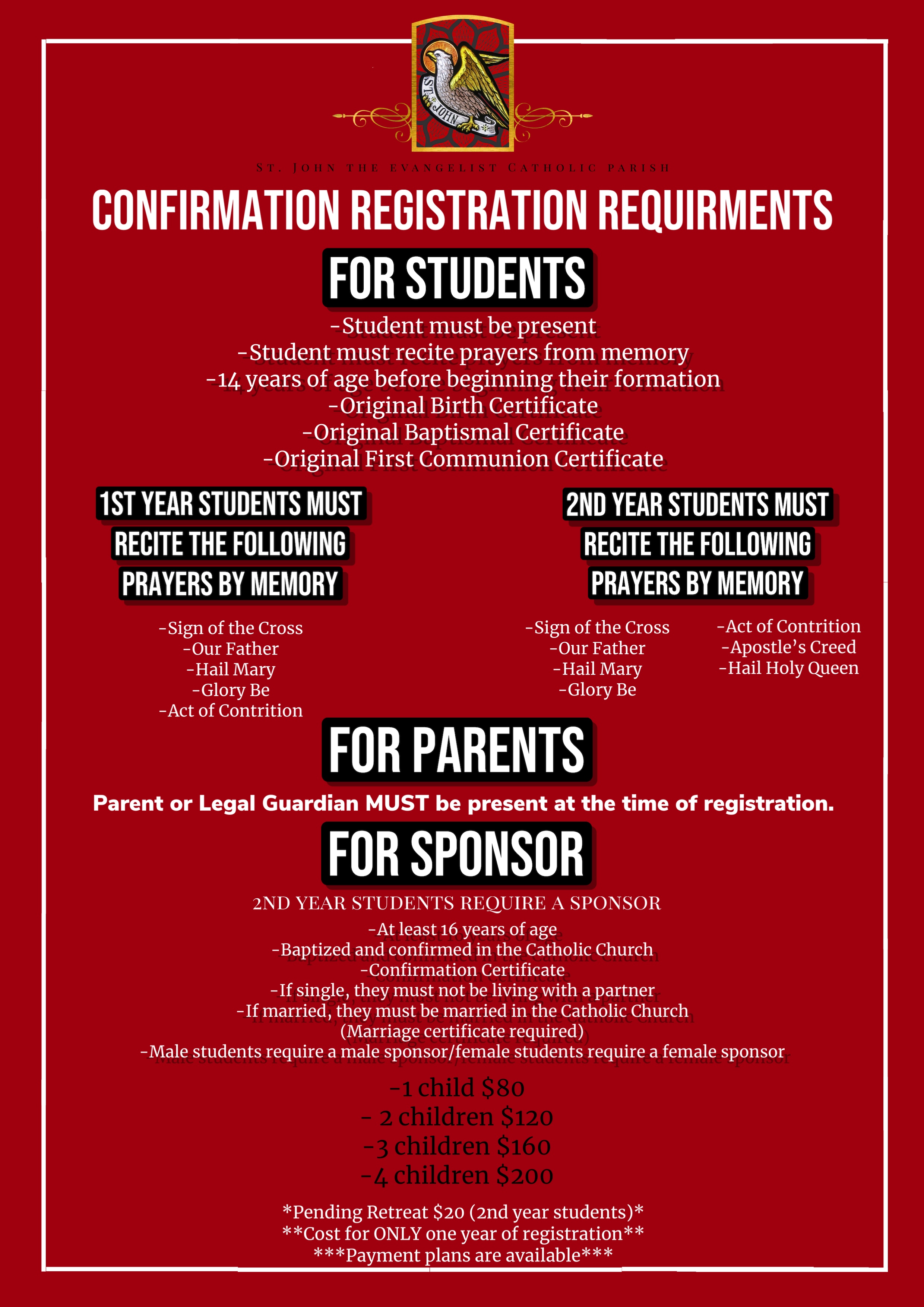 The period to register your child for Confirmation formation has ended. Please view the registration requirements below to enroll your child next year. If you have any questions, please contact the Director of Religious Education, Carmen Sanchez, via phone at (559) 466-6007 or via email at StJohnEvangelistTipton.RE@gmail.com.